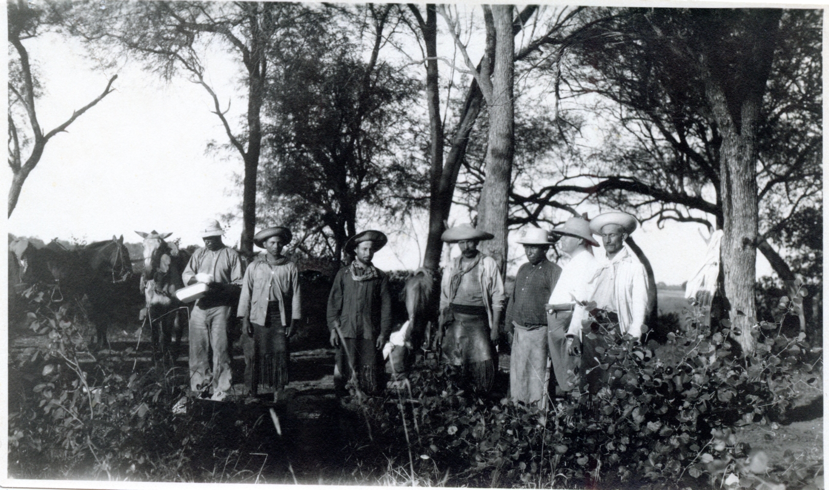 This photo is of 7 men standing in the Paraguayan bush with 2 horses, taken sometime in the 1920s. Second person from the right is Fred Engen. Photograph courtesy of the Mennonite Heritage Archives, Fred Engen Photograph Collection. Reference code: CA MHC 516-1.0 .