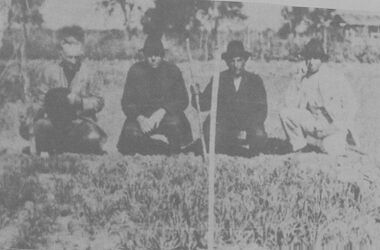 Four members of the Chaco expedition on 1 June 1921 in Puerto Casado. Left-right: Bernhard Toews, Johann Friesen, Jakob Neufeld, and I. Funk. The Canadian wheat they seeded in April is in the background. Photo via Old Colony Mennonites in Canada 2nd edition, ed. Delbert Plett (D.F. Plett Historical Research Foundation, 2011), p. 113.