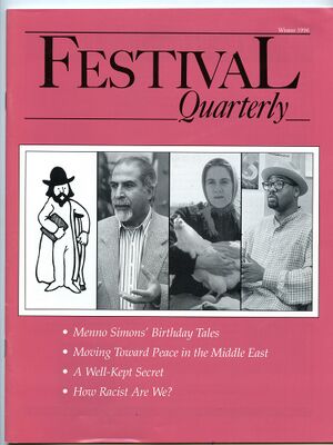 Festival Quarterly usually as a 40 page highly illustrated quarterly magazine on glossy paper of size: 21.5x28 cm. (8.5x11 in.). First published in the spring of 1974 by Dutch Family Festival, Scottdale, Pennsylvania. Its publisher changed to Good Enterprises, Ltd., Intercourse Pennsylvania with issue vol. 3, no.3 (Nov. 1976-Jan. 1977) and ceased publication with volume 23, number 1, winter 1996. Phyllis Pellman Good was the editor and her husband Merle Good the publisher. Its masthead gives this as its purpose: “The Quarterly is dedicated to exploring the culture, faith and arts of various Mennonite groups worldwide, believing that faith and the arts are as inseparable as what we believe is inseparable from how we live.” An annual subscription in 1996 was US$14.00.