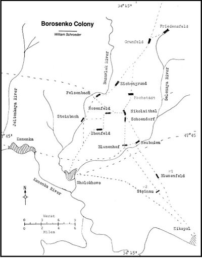 The Borozenko (also spelled Borosenko) Mennonite settlement was founded by the Kleine Gemeinde in 1865. It was located in the southwestern corner of Ekaterinoslav province, Russia (present-day Dnipropetrovsk Oblast, Ukraine), along the Bazavluk and Solenaia Rivers, and 32 kilometers (20 miles) northwest of Nikopol, which served as the settlement's post office.